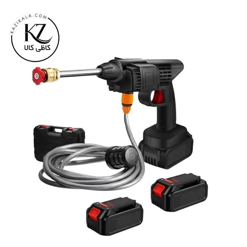 | اقلام همراه | دستگاه اصلی، 2 عدد باتری، شارژر هوشمند، شلنگ 5 متری با فیلتر، مخزن کفپاش، 2 عدد نازل، میله افزایش طول، کیف حمل |