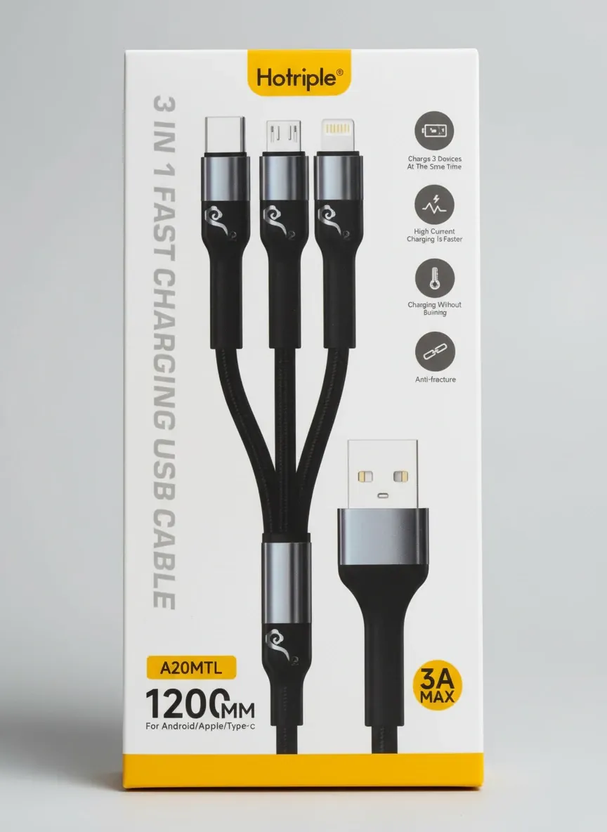 با کابل شارژ 3 در 1 پریمیوم Hotriple مدل A20MTL، استانداردهای خود را برای یک کابل شارژ بالا ببرید! این محصول فقط یک کابل ساده نیست؛ بلکه یک سرمایهگذاری برای راحتی و دوام است. با داشتن سه کانکتور مجزای Lightning (برای آیفون و آیپد)، Type-C (برای تمام گوشیهای اندرویدی جدید، مکبوک و تبلتها) و Micro-USB (برای پاوربانک، هدفون و دستگاههای قدیمیتر)، شما را از حمل هرگونه کابل اضافه بینیاز میکند.