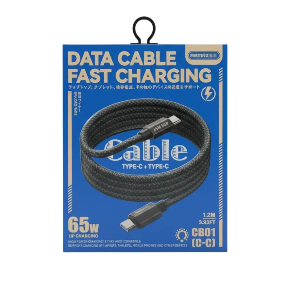 کابل فست شارژ 65 وات Remax CB01: شارژ لپتاپ و موبایل با سرعتی باورنکردنی! (روکش کنفی تایپ C به تایپ C)
